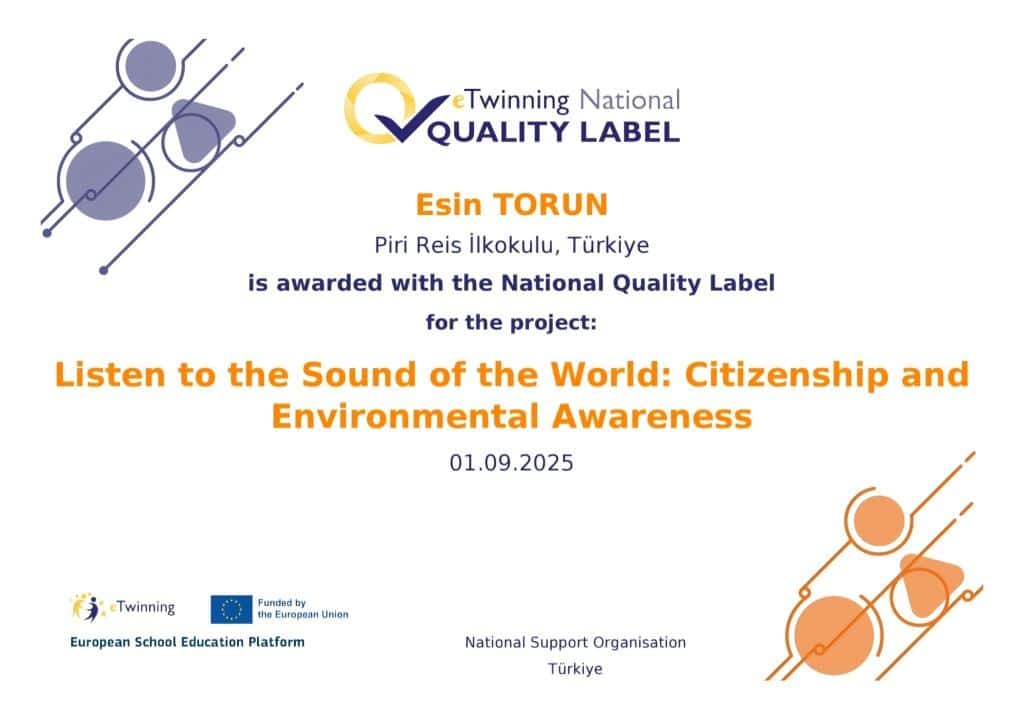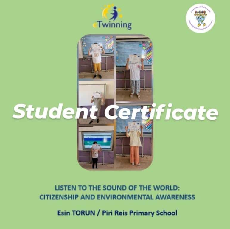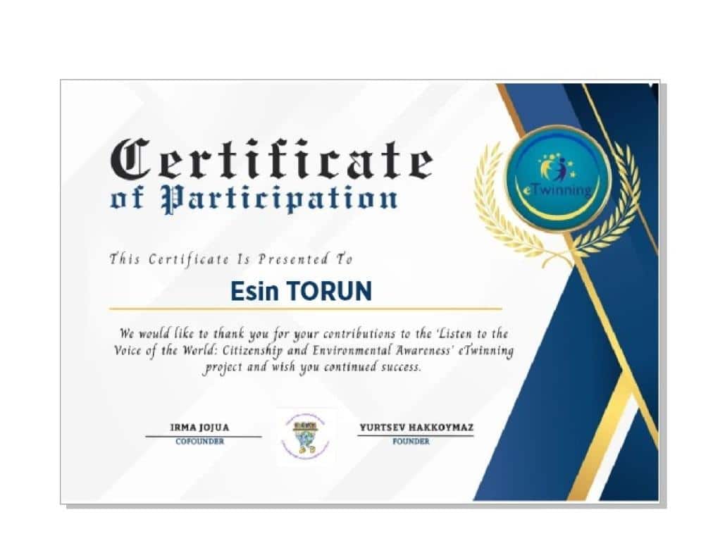E-twinnig projesi katılım sağlayan öğretmenlerimiz Esin TORUN ve Sümeyye GÜLTUTAN ve öğrencilerimizin katılım sertifikası